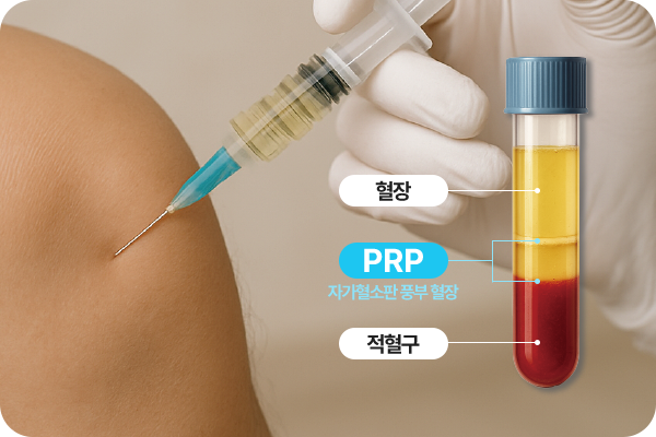 PRP는 혈소판이 풍부한 혈장으로, 환자 본인의 혈액을 뽑아 원심분리기로 돌려서 혈소판이 많이 모여 있는 부분만 뽑아내 주사하는 치료가 PRP주사입니다. 조직을 회복시키는 성장인자가 많이 들어 있는 혈소판을 주사하여 손상된 관절이나 인대·힘줄에 주사하여 치유와 재생을 도와줍니다.치료과정